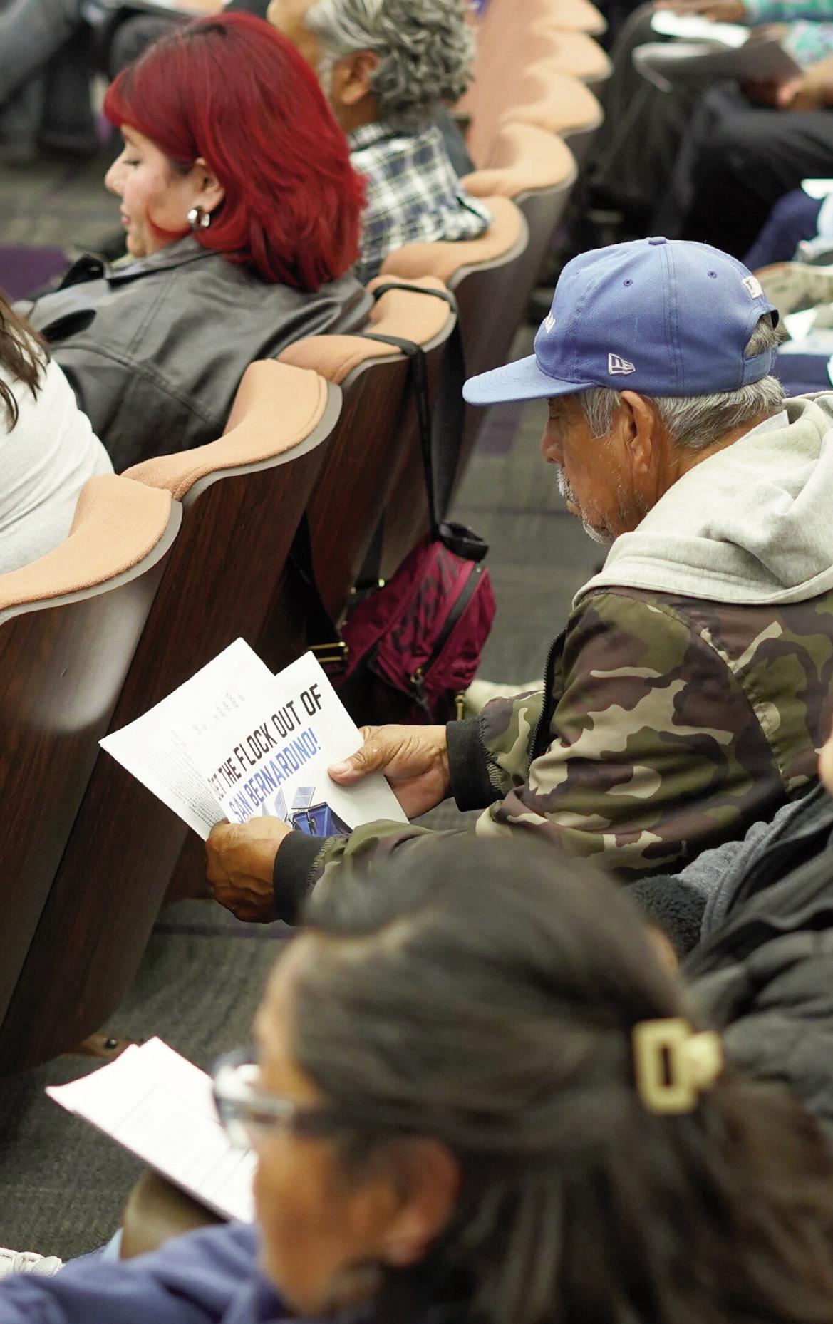 filled with residents and organizers from the Warehouse Worker Resource Center, The People’s Collective for Environmental Justice and Just San Bernardino. Many attendees held signs reading “Get the flock out of SB” in English and Spanish.