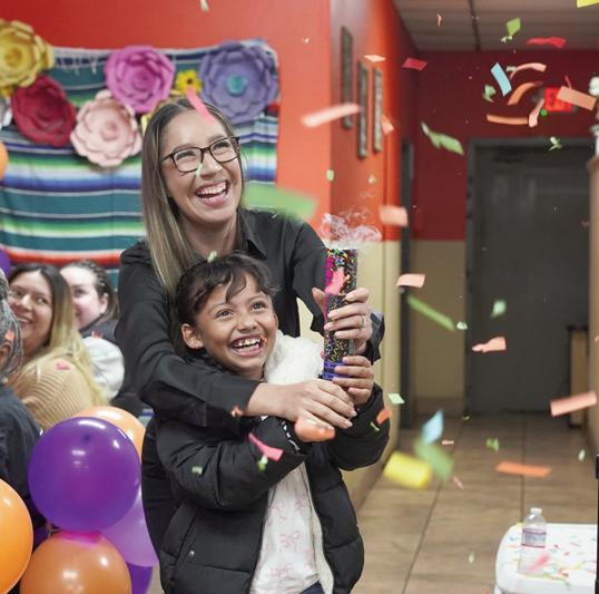 San Bernardino Family YMCA Executive Director Jennifer Lopez and San Bernardino Y Member Jaslenn, a scholarship recipient, popping confetti after announcing how close they are to reaching their donation goal.