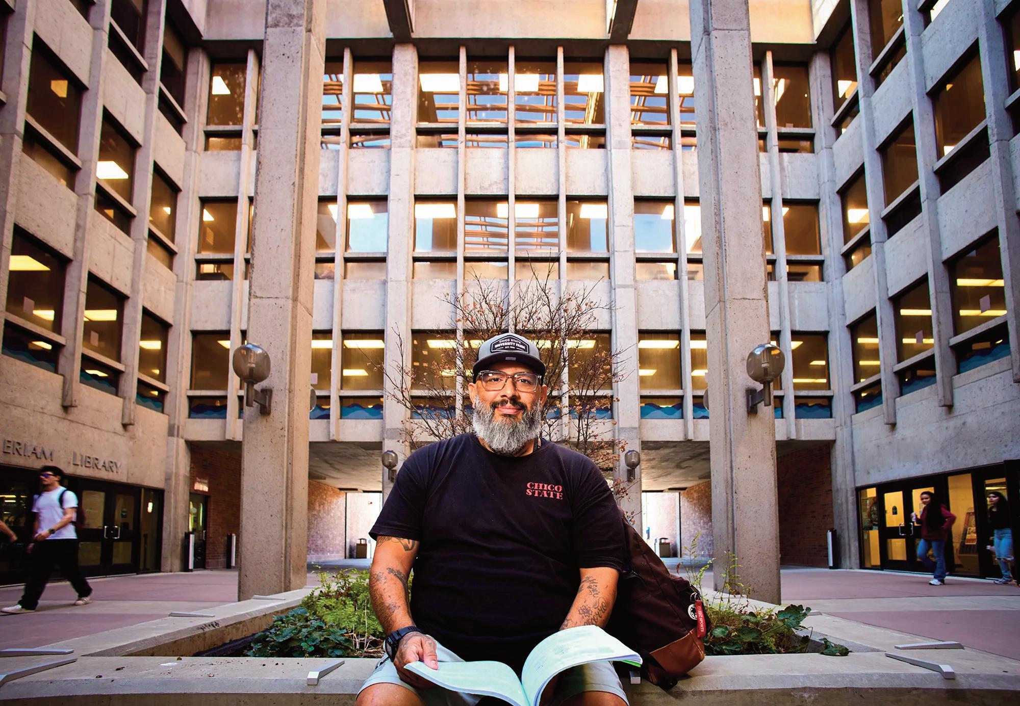 Oscar Deleon Jr., a student and Rapid Rehousing beneficiary, sits outside the Meriam Library at Chico State in Chico on Feb. 5, 2026.