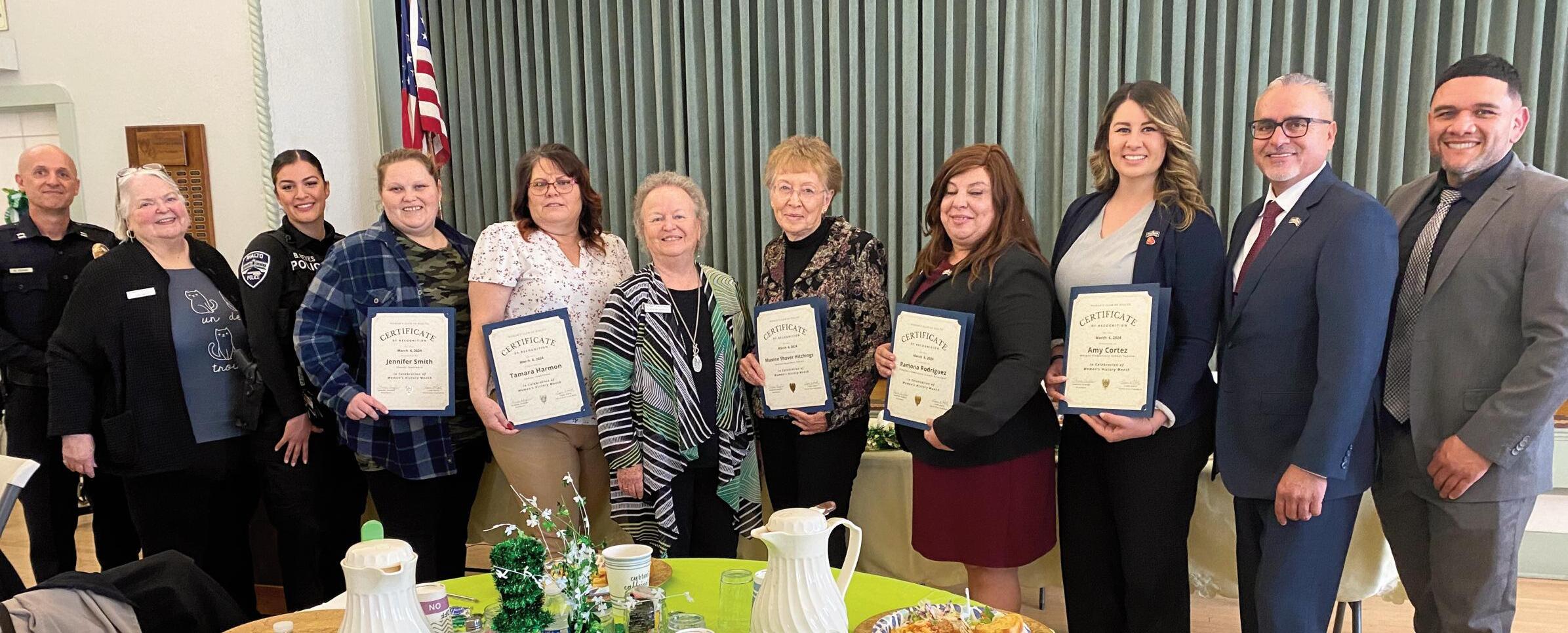 The honorees recognized by the Women's Club of Rialto: Officer Briana Reyes of Rialto PD, Captain Theresa Rivera of Rialto FD, Ramona Rodríguez, Principal of Simpson Elementary School, Amy Cortez, Fourth Grade RUSD Teacher, Barbara McGee, Rialto City Clerk, and Maxine Shaver Hitchings, Kimberly Shaver, Tamara Harmon, and Jennifer Smith of Shaver Insurance