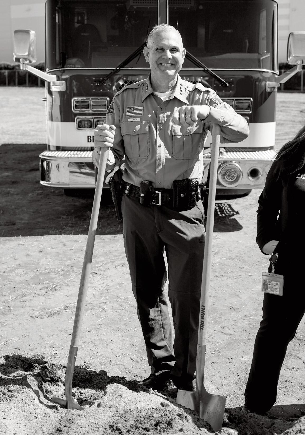 San Bernardino County Sheriff Shannon D Dicus moments before shoveling the first bits of dirt over the project