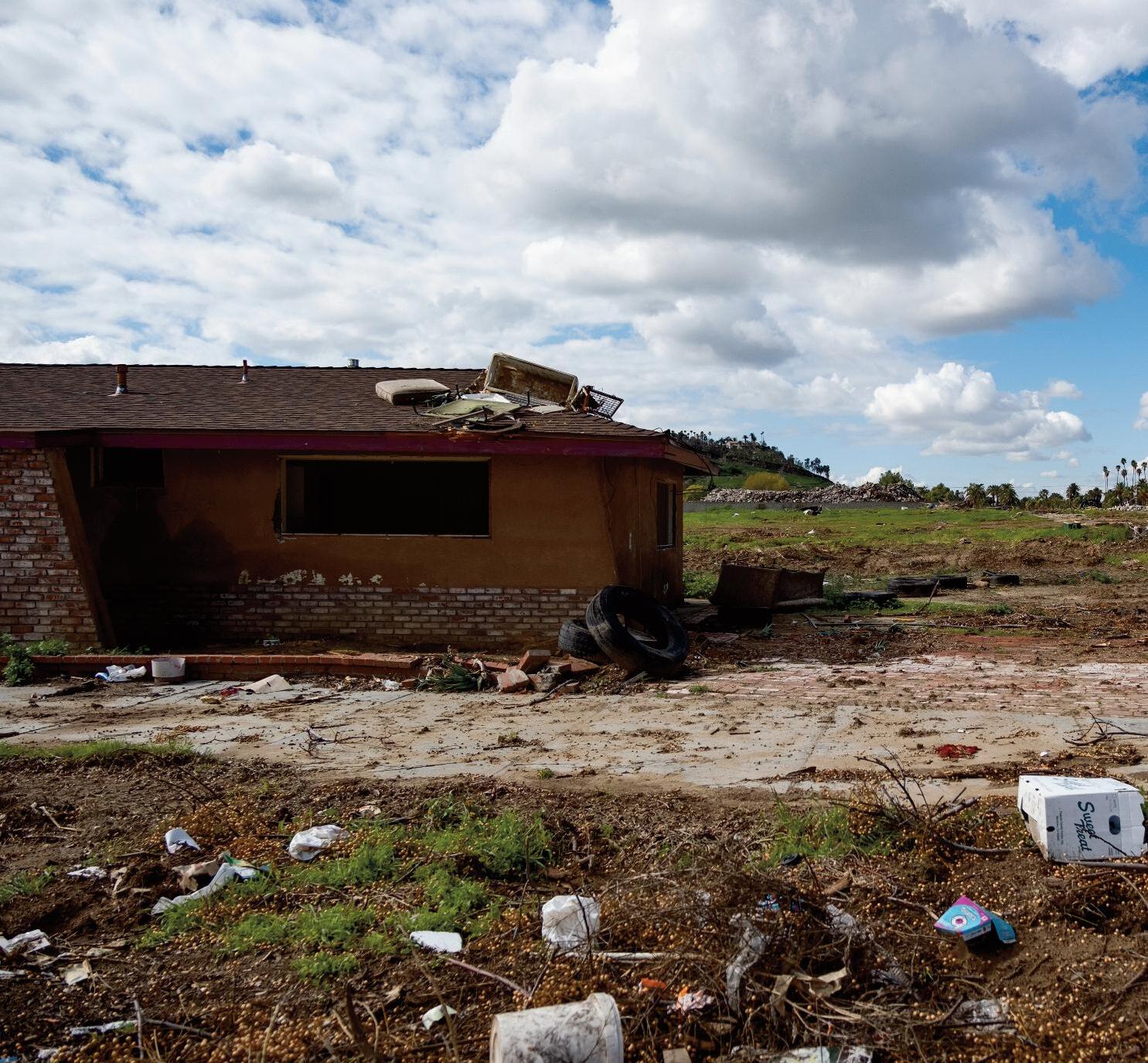 A home sits abandoned with scattered trash and debris