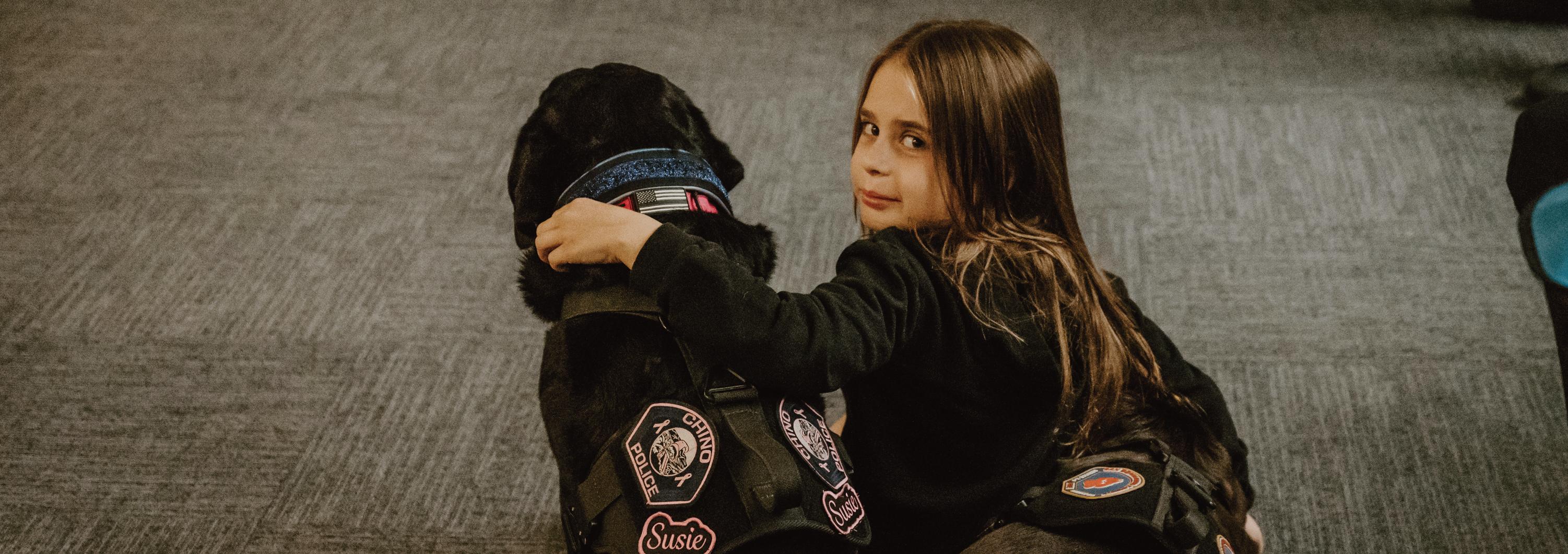 A young attendee embraces one of the support service dogs at the Blue Envelope Program training, highlighting the event’s