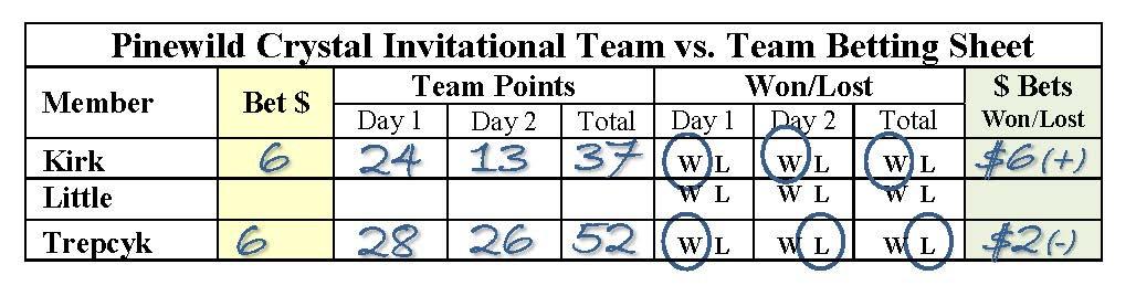 The Five Round Total is one hundred (100) points, if a team won all of the holes played. Points are won based on one net best ball per team beating or tying the other team’s best ball. Winning a hole equals two (2) points, tying a hole equals one (1) point, and losing a hole is zero (0) points.