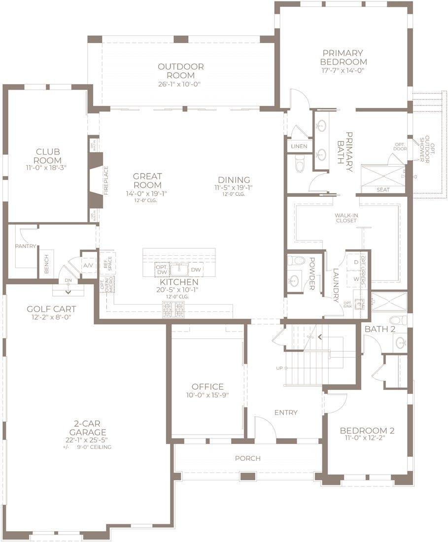 This 3,542-square-foot floorplan, inspired by the legacy of American golf, combines elegance with a passion for the game. The open, centrally located great room creates an expansive yet welcoming space, ideal for hosting both large gatherings and intimate get-togethers. Thoughtfully designed outdoor areas extend your living space, while a variety of customizable options allow you to tailor the interiors to reflect your personal lifestyle.