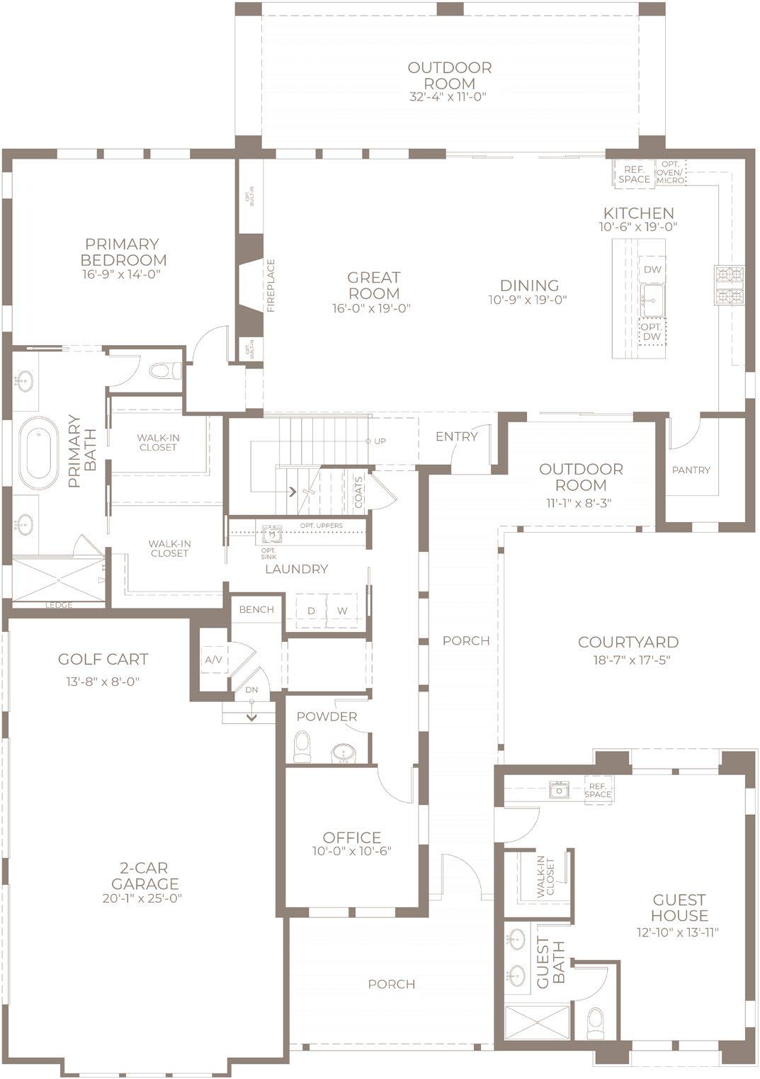 This spacious 2,786-square-foot, four-bedroom floorplan makes the most of the North Carolina’s extraordinary climate, while offering ample personal and gathering space. Featuring an integrated guesthouse connected to the main house through an elegant outdoor courtyard, this home is perfect for hosting visitors or offering family members their own private retreat. The two generous outdoor rooms provide the ideal setting for enjoying Pinehurst’s beautiful evenings, while a variety of exterior elevations allows you to choose a design that reflects your personal style. A true blend of luxury and functionality, this home offers a refined yet welcoming atmosphere.