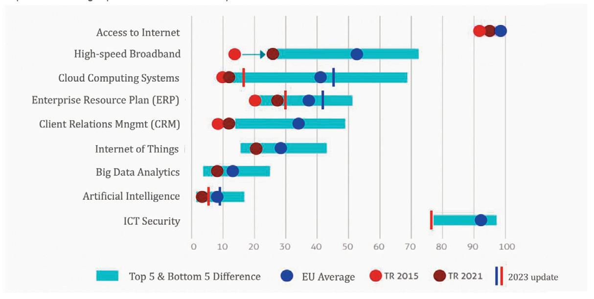 Recent advancements in digital tool adoption among Turkish businesses indicate a positive trajectory. However, significant gaps remain, especially in the integration of advanced digital solutions such as enterprise resource planning (ERP) systems and high-speed broadband in