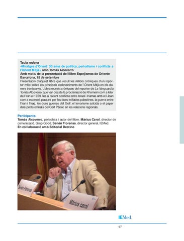 Taula rodona «Miratges d’Orient: 30 anys de política, periodisme i conflicte a l’Orient Mitjà», amb Tomàs Alcoverro Amb motiu de la presentació del llibre Espejismos de Oriente Barcelona, 18 de setembre Presentació d’aquest llibre que recull les millors cròniques d’un reporter mític sobre els principals esdeveniments de l’Orient Mitjà en els darrers trenta anys. L’obra reuneix cròniques del reporter de La Vanguardia Tomàs Alcoverro, que van des de la proclamació de Khomeini com a líder de l’Iran el 1979 fins al recent conflicte entre Israel i Hamas amb el Líban com a escenari, passant per les dues intifades palestines, la guerra entre l’Iran i l’Iraq, les dues guerres del Golf, el terrorisme suïcida o el paper dels petits emirats del Golf Pèrsic en les relacions regionals. Participants: Tomàs Alcoverro, periodista i autor del llibre, Màrius Carol, director de comunicació, Grup Godó, Senén Florensa, director general, IEMed. En col·laboració amb Editorial Destino