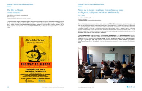 Ponents: Mariam Abdo, Ligue des droits de la femme libanaise. Fouzia Assouli, FFEM. Soukaina Bouraoui, CAWTAR. Wafa Ellouni, Mouwatinet. Joelle Abou Farhat, Women in Front. Esther Fouchier, Forum Femmes Méditerranée. Fairouz Habache, Women in Business Algeria. Rahma Houzig, Tamaynut. Mohammed Kadiri, Tazghart. Chérifa Kheddar, Association DJAZAIROUNA. Selly Rais, La Ruche de la citoyenneté active à Tozeur. Serena Romano, Corrente Rosa. Maria-Àngels Roque, IEMed. Zohra Sadik, Fédération des ligues des droits des femmes de Marrakech. Émilie Vidal, IEMed.