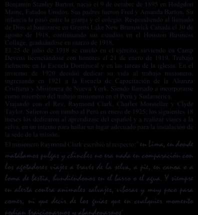 Benjamín Stanley Barton, nació el 9 de octubre de 1895 en Hodgdon Maine, Estados Unidos. Sus padres fueron Fred y Amanda Barton. Su infancia la pasó entre la granja y el colegio. Respondiendo al llamado de Dios al bautizarse en Greens Lake New Brunswick Canadá el 30 de agosto de 1918, continuando sus estudios en el Houston Business Collage, graduándose en marzo de 1918. El 25 de julio de 1918 se enroló en el ejército; sirviendo en Camp Devens licenciándose con honores el 21 de enero de 1919. Trabajó fielmente en la Escuela Dominical y en las tareas de la iglesia. En el invierno de 1920 decidió dedicar su vida al trabajo misionero, ingresando en 1921 a la Escuela de Capacitación de la Alianza Cristiana y Misionera de Nueva York. Siendo llamado a incorporarse como miembro del trabajo misionero en el Perú y Sudamérica. Viajando con el Rev. Raymond Clark, Charles Morstellar y Clyde Taylor. Salieron con rumbo al Perú en enero de 1925; los siguientes 18 meses los dedicaron al aprendizaje del español y a realizar viajes a la selva, en un intento para hallar un lugar adecuado para la instalación de la sede de la misión.