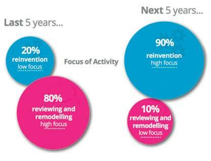 Prior to 2015, 20 per cent said reinvention was a low focus area, with 80 per cent stating reviewing and remodelling was a high focus. However, for the five years ahead to 2020, 90 per cent said reinvention would be a high focus (see graph A).