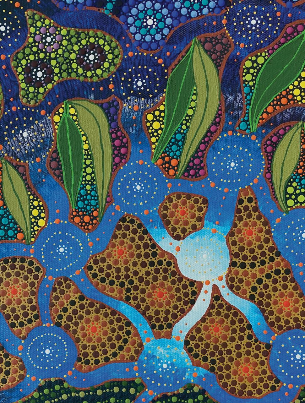 “I started with the IEU Logo and symbolised it with a yellow/ochre Australia in a forest green circle. In the centre is the land (Australia), gum leaves and bush foods (macadamias of the North Coast) – surrounded by the colours of the Australian bush. The blues represent connections to the sea, ocean that surround our country. Spirit circles that depict our shared stories and spiritual connections to the Great Southern Land.”