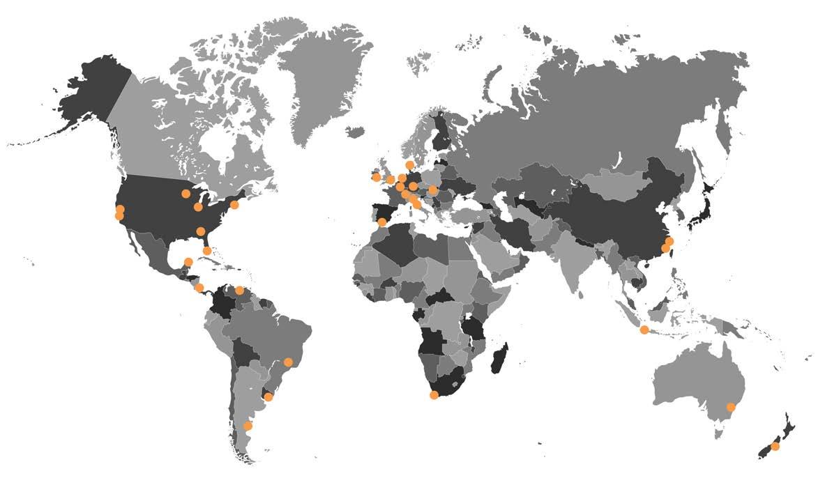 Cities per continent: North America, 7; South America, 6; Europe, 11; Africa, 1; Asia, 3; Oceania, 2