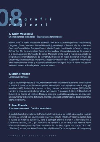 En attendant les hirondelles | În așteptarea rândunelelor Născut în 1976, Karim Moussaoui este realizator a trei scurtmetraje și unui mediumetraj, Les jours d’avant, remarcat în mod deosebit (prin selecții la festivalurile de la Locarno, Clermont-Ferrand, Brive, Premiers Plans – Marele Premiu, dar și finalist la César în categoria Cel mai bun film de scurtmetraj). Este membru fondator al asociației culturale de promovare a cinematografiei Chrysalide din Alger. Mai mulți ani la rând, a fost și responsabil cu programarea cinematografului de la Institutul Francez din Alger. Scenariul primului său lungmetraj, En attendant les hirondelles, a fost dezvoltat în cadrul rezidenței Cinéfondation a Festivalului de la Cannes și în cadrul atelierelor de la Angers. În 2016, Karim Moussaoui a devenit laureat al Fundației Gan pentru Cinéma.