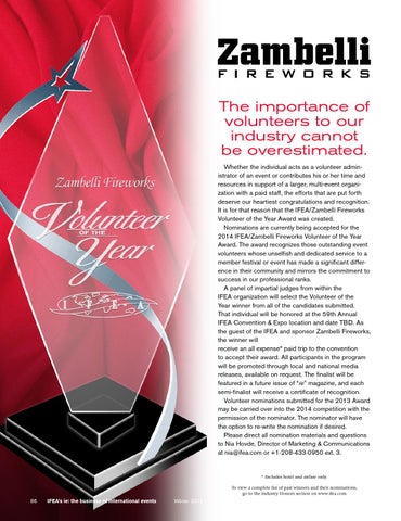 The importance of volunteers to our industry cannot be overestimated. Whether the individual acts as a volunteer administrator of an event or contributes his or her time and resources in support of a larger, multi-event organization with a paid staff, the efforts that are put forth deserve our heartiest congratulations and recognition. It is for that reason that the IFEA/Zambelli Fireworks Volunteer of the Year Award was created. Nominations are currently being accepted for the 2014 IFEA/Zambelli Fireworks Volunteer of the Year Award. The award recognizes those outstanding event volunteers whose unselfish and dedicated service to a member festival or event has made a significant difference in their community and mirrors the commitment to success in our professional ranks. A panel of impartial judges from within the IFEA organization will select the Volunteer of the Year winner from all of the candidates submitted. That individual will be honored at the 59th Annual IFEA Convention & Expo location and date TBD. As the guest of the IFEA and sponsor Zambelli Fireworks, the winner will receive an all expense* paid trip to the convention to accept their award. All participants in the program will be promoted through local and national media releases, available on request. The finalist will be featured in a future issue of “ie� magazine, and each semi-finalist will receive a certificate of recognition. Volunteer nominations submitted for the 2013 Award may be carried over into the 2014 competition with the permission of the nominator. The nominator will have the option to re-write the nomination if desired. Please direct all nomination materials and questions to Nia Hovde, Director of Marketing & Communications at nia@ifea.com or +1-208-433-0950 ext. 3.