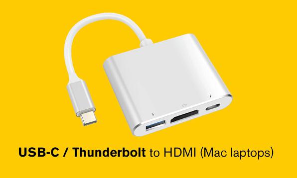 Newer Mac laptops (Air Models) don’t have an HDMI port. Instead, they use a USB-C/Thunderbolt port. For this setup, you will need a USB-C/Thunderbolt to HDMI adapter. See Example 8 pn the previous page.