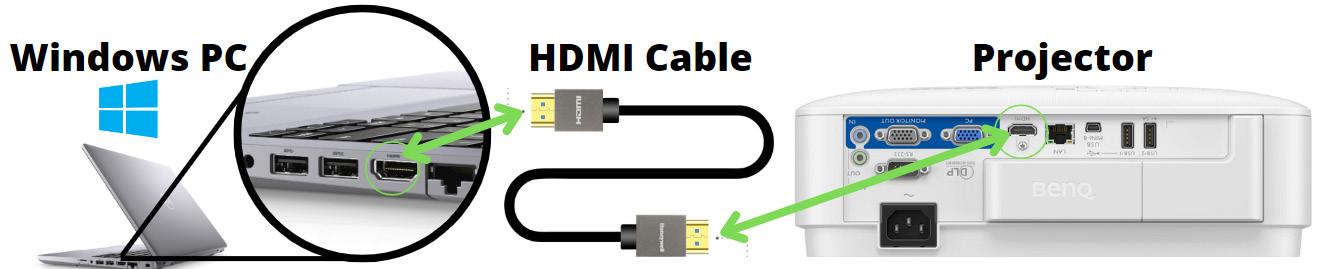 See Example 5 on the left of the page. Both the Windows computer and the projector have an HDMI port. The connection can be done using only an HDMI cable.