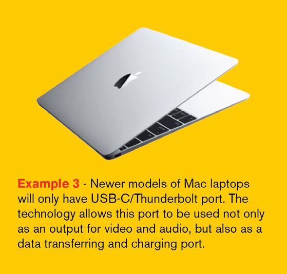 Example 3 - Newer models of Mac laptops will only have USB-C/Thunderbolt port. The technology allows this port to be used not only as an output for video and audio, but also as a data transferring and charging port.
