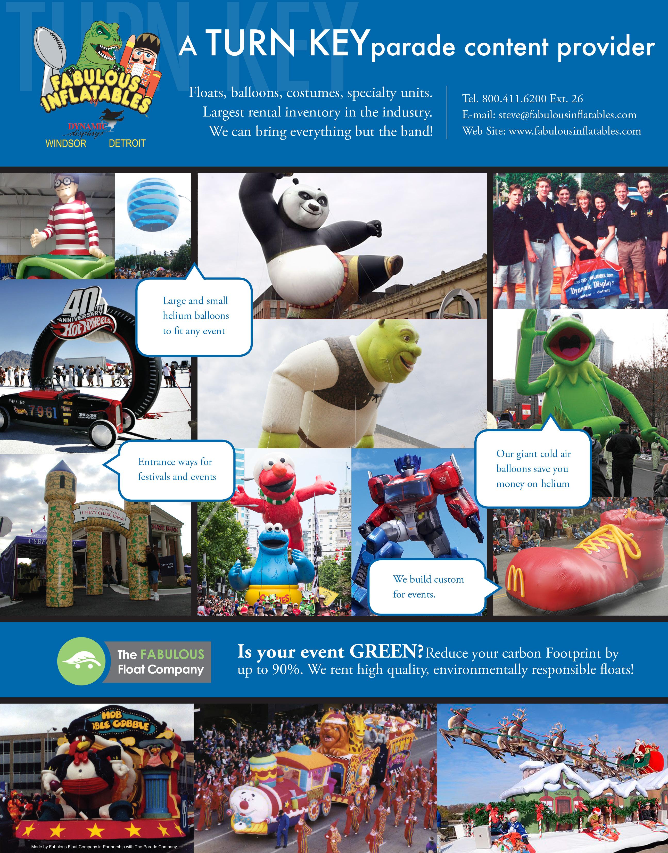 DYNAMIC DISPLAYS / FABULOUS INFLATABLES – Designs, manufacturers, for rent or purchase – costumes, props, floats, helium balloons, event entry ways and décor. Offers complete and flexible service packages for small towns and large international events. 50+ years of parade/event experience. Contact: Steve Thomson | Dearborn, MI USA | 800-411-6200 | steve@fabulousinflatables.com | www.fabulousinflatables.com