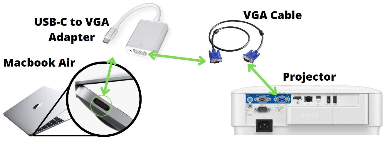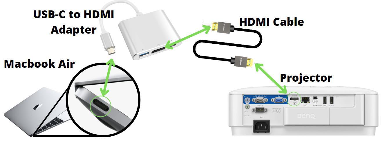 The HDMI connection is currently the most common. Nearly all modern monitors and projectors feature HDMI ports. Most laptop computers support HDMI, and it’s becoming more prevalent on desktop computers. If your Windows laptop has an HDMI port, you can connect directly to the projector using only an HDMI cable. If you are using a Mac laptop on the other hand, you will likely need an USB-C or Thunderbolt to HDMI adapter. The same is true if the projector has a VGA input and your computer has a VGA port. In most other cases, you will need an adapter. Bear with us! It’s a lot less complicated than what it sounds.