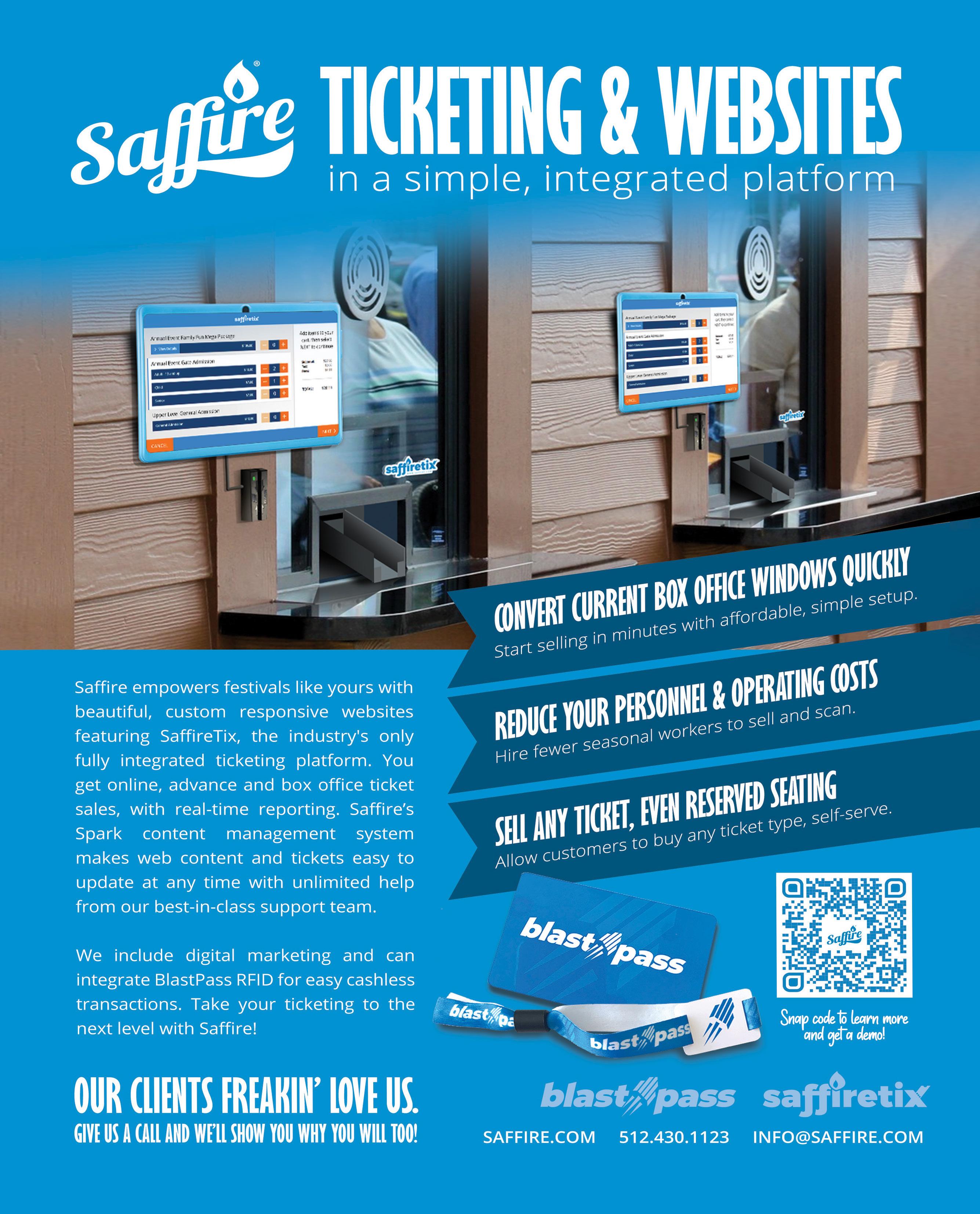 SAFFIRE – Saffire empowers clients with beautiful, unique and engaging websites that are easy to manage, with integrated SaffireTix ticketing and unlimited help when you need it. Contact: Cassie Dispenza | Austin TX USA | 512-430-1123 sales@saffire.com | www.saffire.com