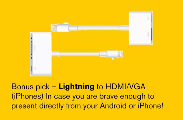 That wasn’t that complicated, right? Think of it this way, you will need one of two types of cables, an HDMI or VGA cable. Depending on your laptop you might need an adapter. Overall, there’s only 3 components that you should always account for, your laptop, your adapter and your HDMI or VGA cable. A great idea is for you to create your own travel kit with all the components you will use. Adapters and cables are very affordable, so having a couple of each is highly recommended. Just in case a colleague calls you at the last minute asking you for an adapter…