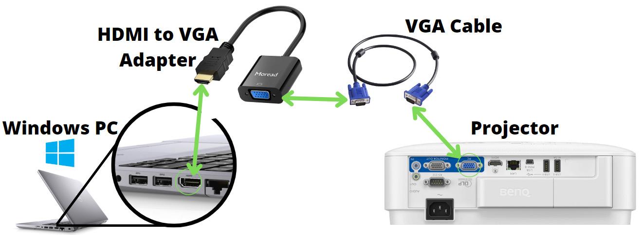 When you’re dealing with an older model of projector, you will have a VGA port only. For this type of connection, you will need a VGA adapter. See Example 9 above.