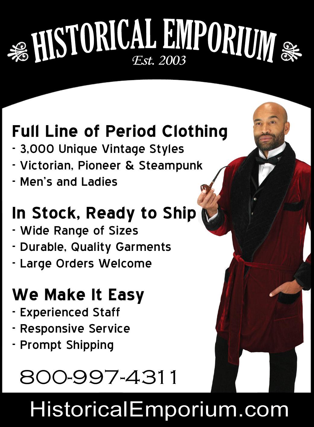 HISTORICAL EMPORIUM – Historical Emporium specializes in authentic, durable, high quality historical clothing and accessories. Victorian, Edwardian, Old West and Steampunk for men and women. Since 2003. Contact: Noel Matyas | San Jose, CA USA | (800) 997-4311 | amusement@historicalemporium.com | www.historicalemporium.com