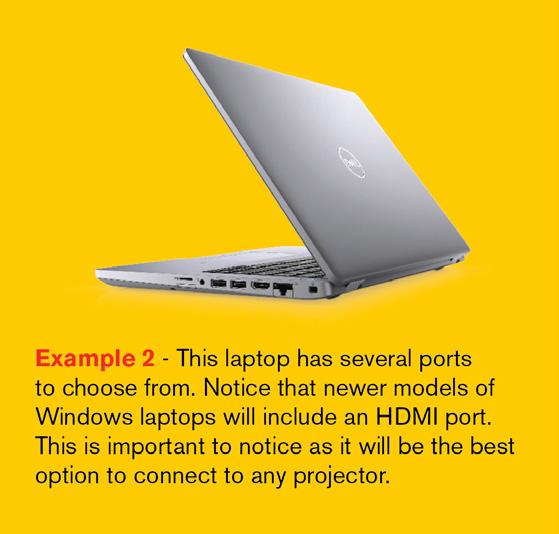 If you use a Mac laptop (Example 3), you will notice that the video output ports vary from model to model. If your Mac laptop is a few years old, you may be in luck and have an HDMI port. Newer models have adopted the USB-C/Thun derbolt port. Remember! Don’t assume that all laptops are the same just because they are Windows or Mac. Specifications and components change very frequently.