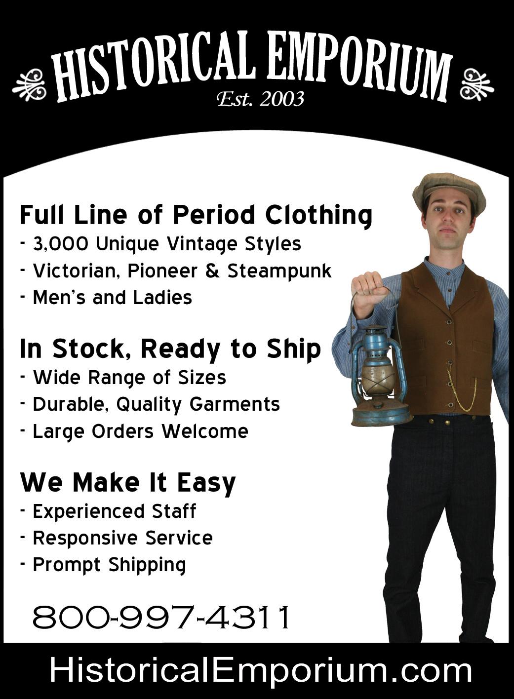 HISTORICAL EMPORIUM – Historical Emporium specializes in authentic, durable, high quality historical clothing and accessories. Victorian, Edwardian, Old West and Steampunk for men and women. Since 2003. Contact: Noel Matyas | San Jose, CA USA | (800) 997-4311 | amusement@historicalemporium. com | www.historicalemporium.com