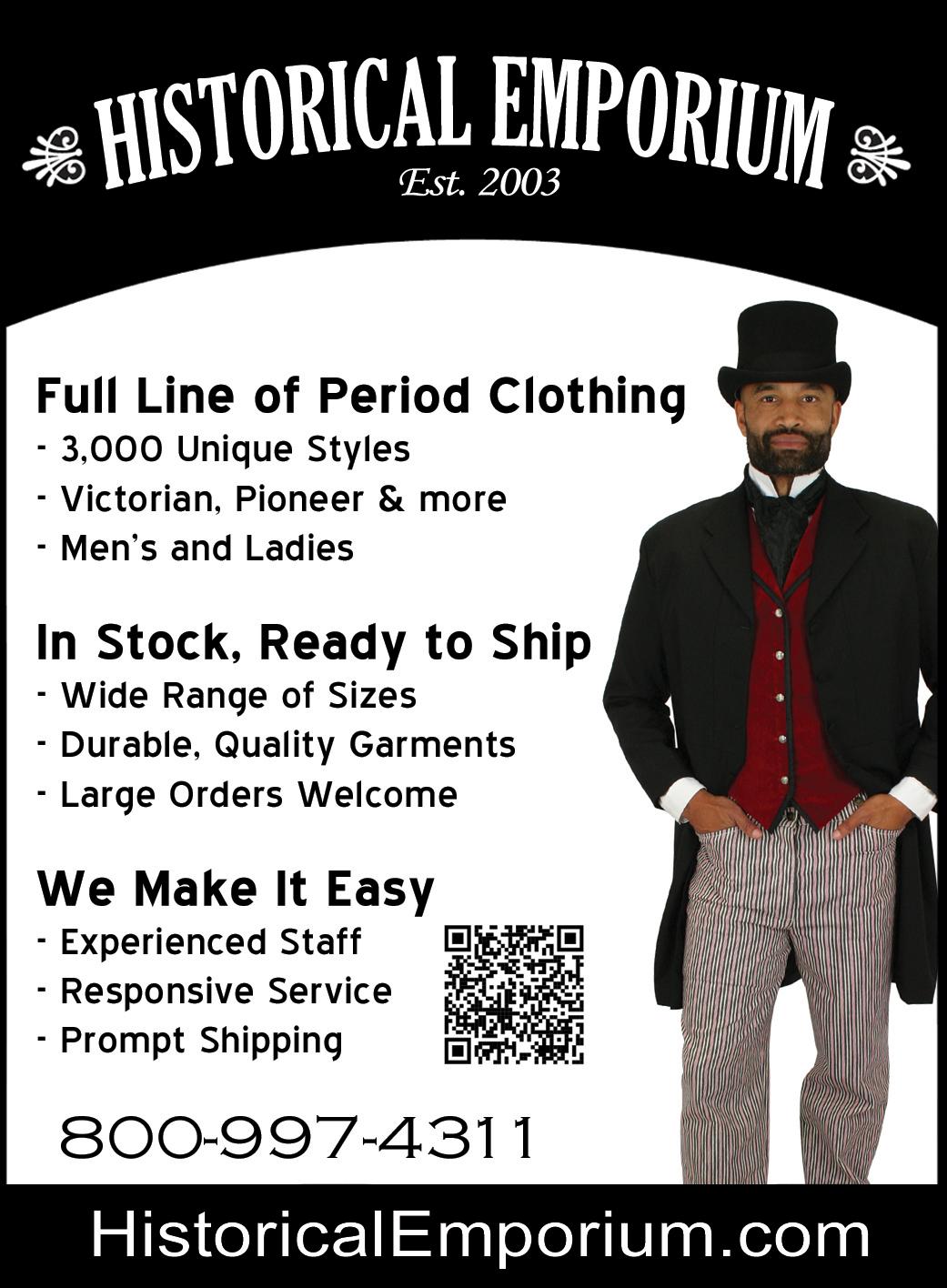 HISTORICAL EMPORIUM – Historical Emporium specializes in authentic, durable, high quality historical clothing and accessories. Victorian, Edwardian, Old West and Steampunk for men and women. Since 2003. Contact: Noel Matyas | San Jose, CA USA | (800) 997-4311 amusement@historicalemporium.com | www.historicalemporium.com