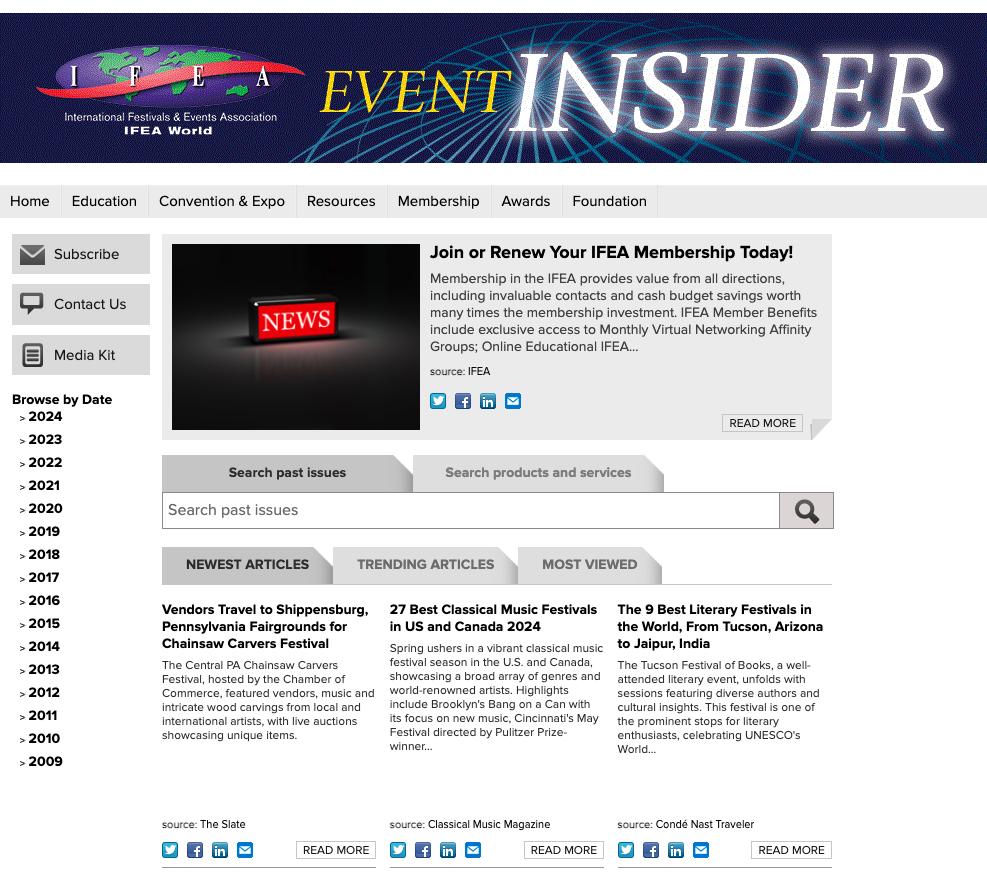 TRIP Info com – Since 1996, first online reference for all segments of group travel planners – website and weekly newsletter and subject-specific digital magazines – including festivals. IFEA Member organizations included online. Contact: Eric Cunningham | 8735 Dunwoody Place STE N | Atlanta, GA, 30350, USA info@TRIPinfo.com | www.tripinfo.com