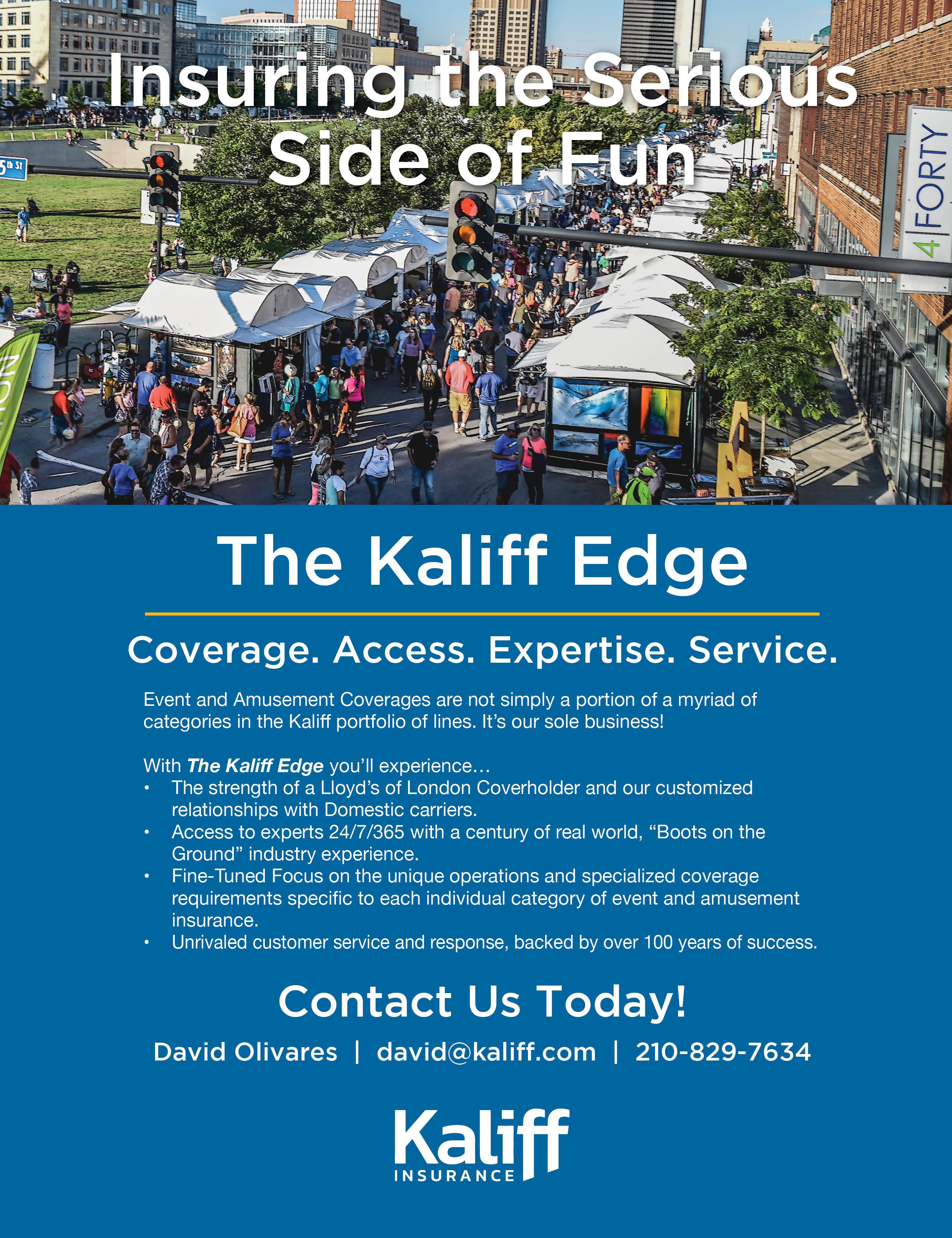 KALIFF INSURANCE – Founded in 1917, Kaliff Insurance provides specialty insurance for festivals, fairs, parades, rodeos, carnivals and more. We insure the serious side of fun! Contact: David Olivares | San Antonio, TX USA (210) 829-7634 | david@kaliff.com | www.kaliff.com