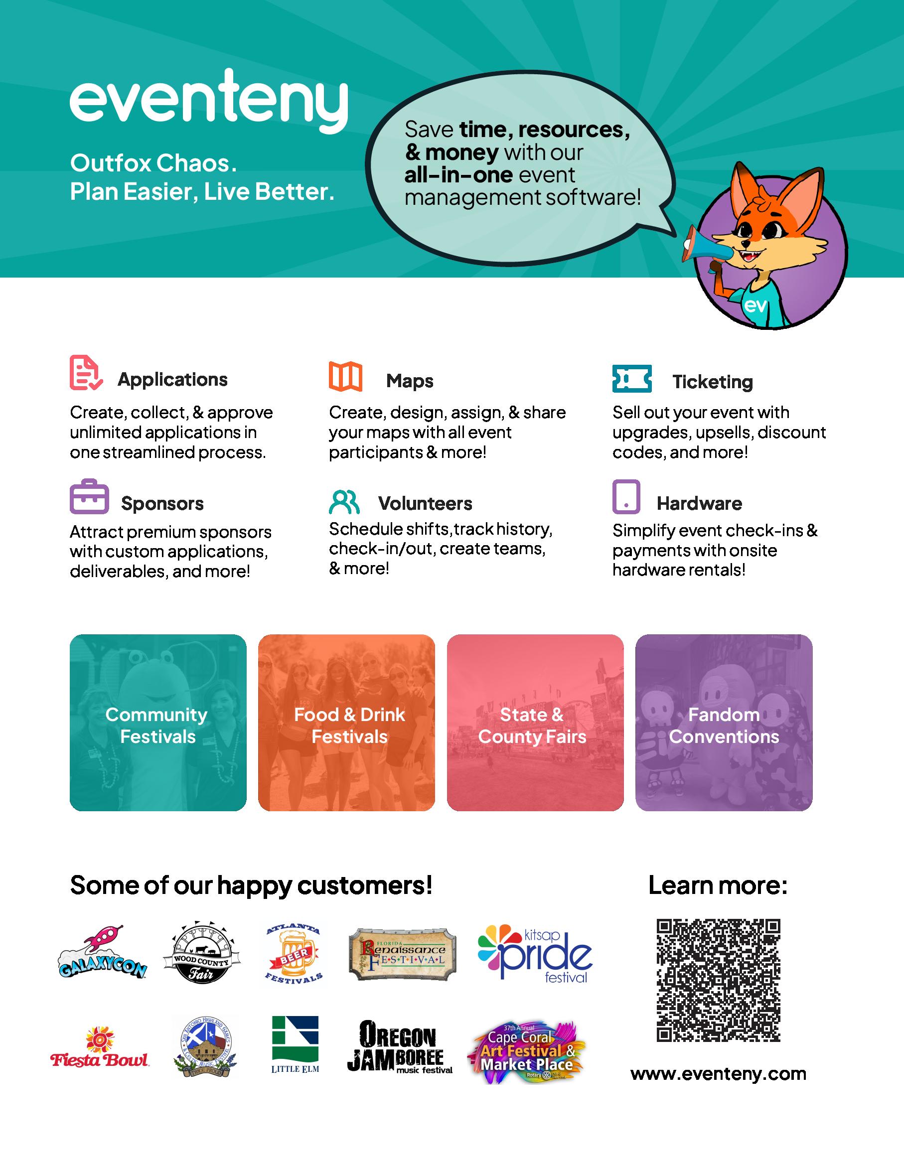 EVENTENY – Eventeny was built to help festival & event organizers manage their vendors, artists, exhibitors, volunteers, and sponsors, all in one platform. You can create team workflows, applications, maps, schedules, surveys and so much more. From small community festivals to managing multi-day sci-fi conventions, to virtual events, we’ve got it all! Contact: Greg Wright | Peachtree Corners, GA 30092-2936 USA | Phone: (314) 471-6079 | greg@eventeny.com www.eventeny.com