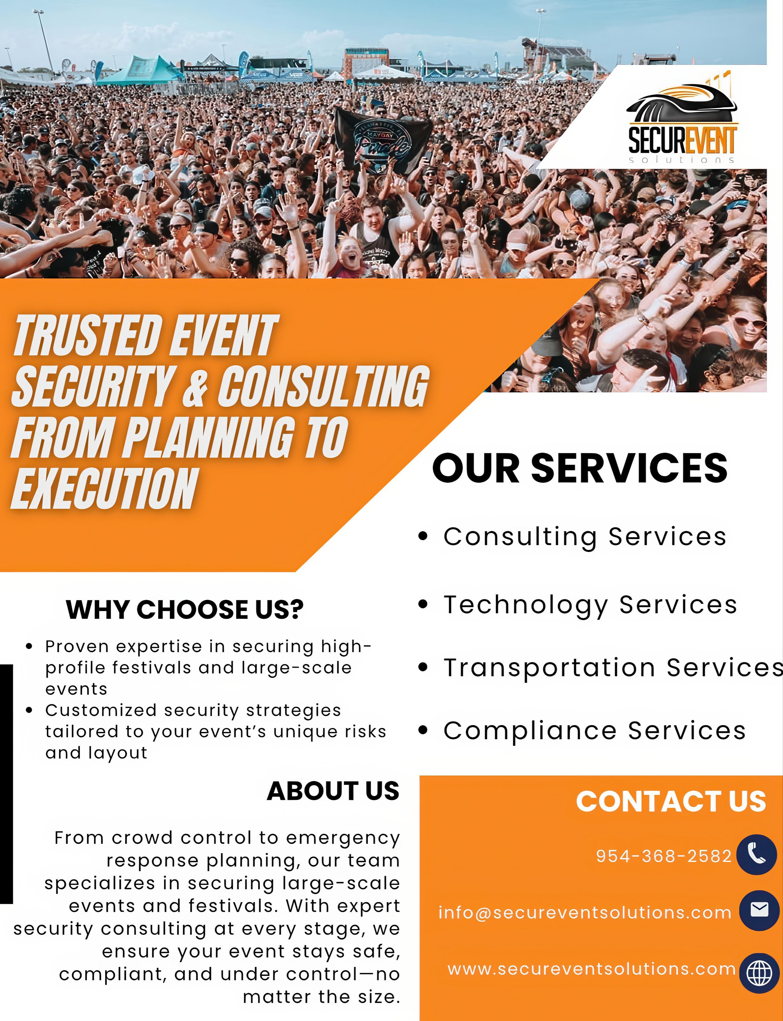 SECUREVENT SOLUTIONS – At SecurEvent Solutions we believe your event is as unique as you are. Carefully blending and merging operations, sales, experience, culture, to curate lasting memories. We call this your Event DNA. Understanding your Event DNA allows SecurEvent Solutions to build security operations that will integrate with all event areas. Contact: Joshua Field | Ft. Lauderdale, FL USA (763) 226-4162 | jfield@secureventsolutions.com | www.secureventsolutions.com/