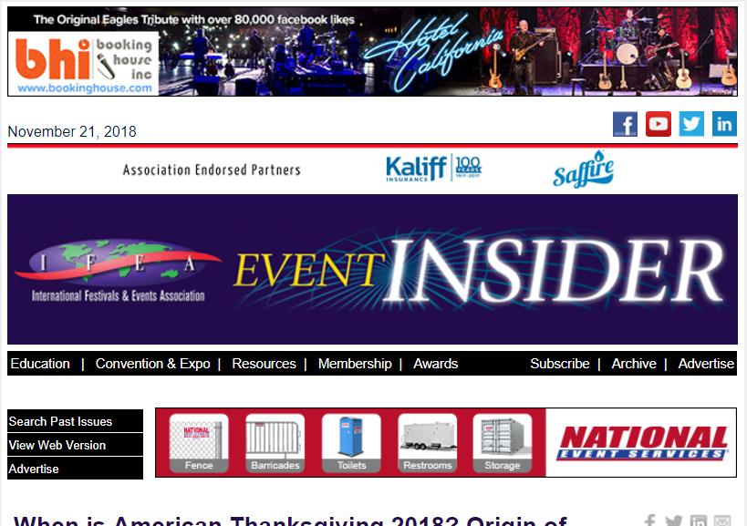 TRIP Info.com – Since 1996, first online reference for all segments of group travel planners – website and weekly newsletter and subject-specific digital magazines – including festivals. IFEA Member organizations included online. Contact: Eric Cunningham | 8735 Dunwoody Place STE N | Atlanta, GA, 30350, USA info@TRIPinfo.com | www.tripinfo.com