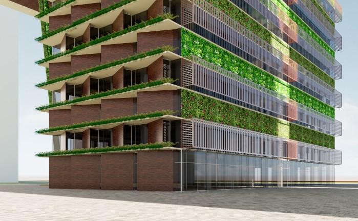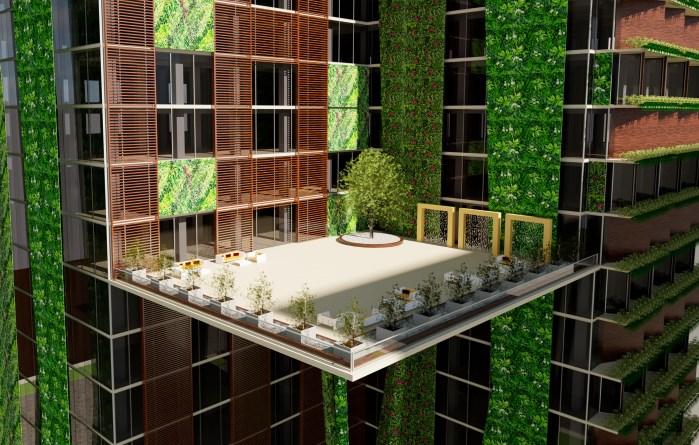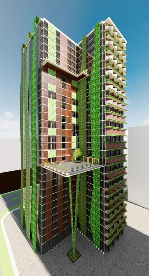 TheGreenOfficeisa30-StoreyEco-OfficeBuildingthatis environmentallyfriendlyandaccessibletothedisabled.The buildinghastactilesurfacesonthefloors,brailleonthe buttons,andotherfeaturesdesignedtomeettheneedsof peoplewithdisabilities.Thewallsaremadeupofgreenery andabsorbsunlight,creatingacooler,morepleasant atmosphereduringthesummertime,andreducingambient noise;thewallsalsoactassoundbarriers.