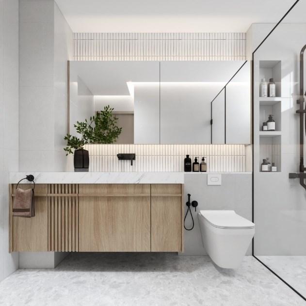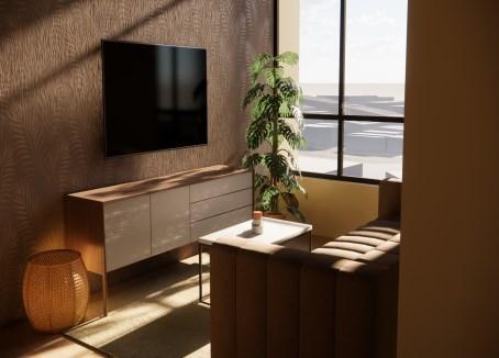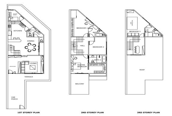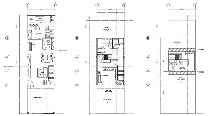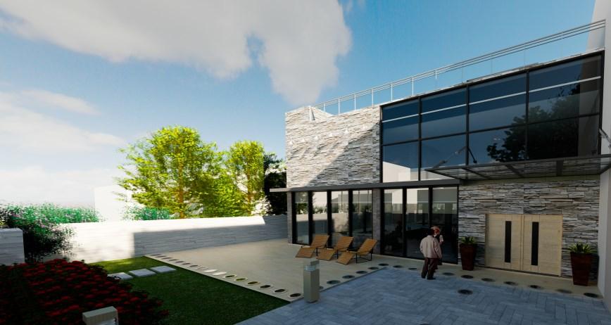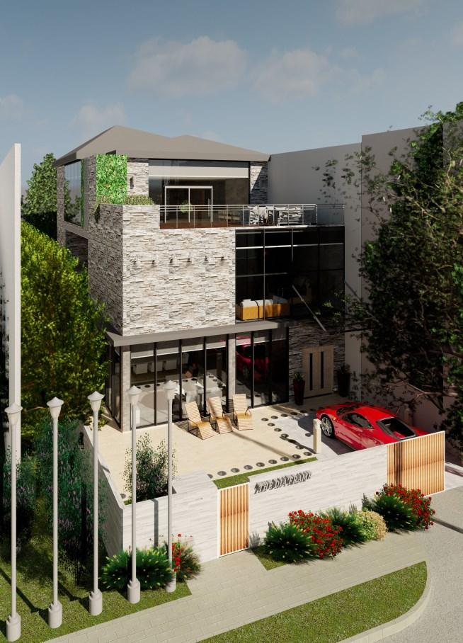 Proposed a three-storey high semi-detached house. Shown are rendered images of the exterior with tall trees surrounding the house. This house is surrounded by many curtain walls, giving it a luxurious appearance and allowing a substantial amount of natural light to go through. The attic was converted into a room with a rooftop deck.