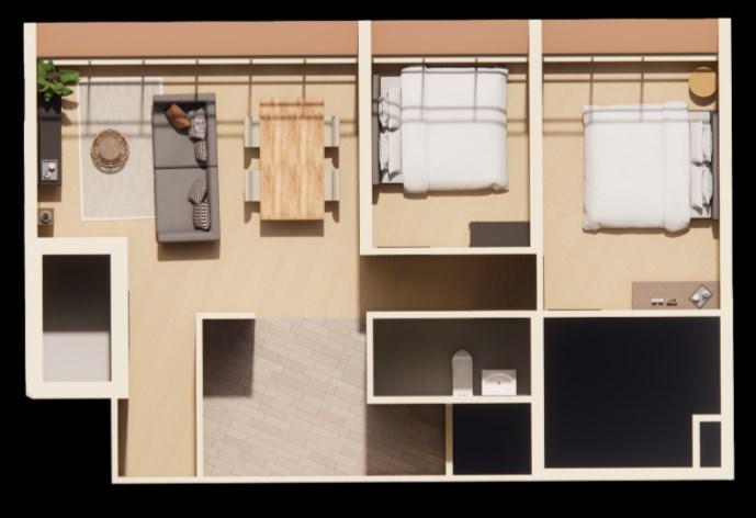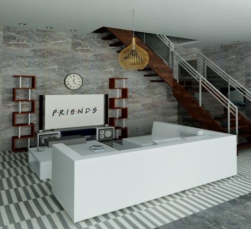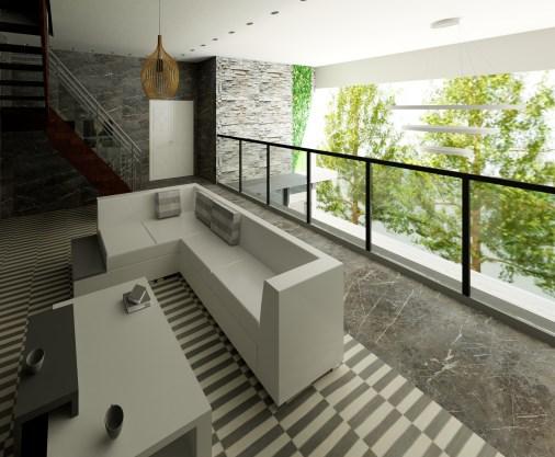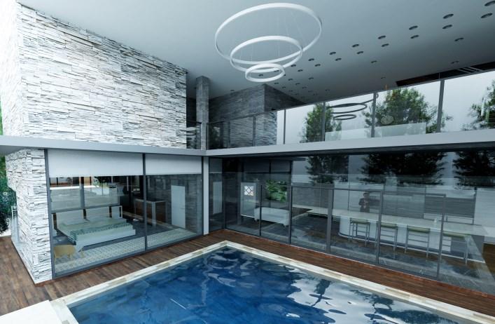 Renderedimagesofthelivingroom,swimmingpool,and entertainmentroom.Tocreatea'luxury'look,Ichosewhite furniture,marbleflooring,andwalls.Furthermore,thehouse alsohasamezzanineoverthepoolareaplantedwithtalltrees, givingthefeelofanaturalenvironment.