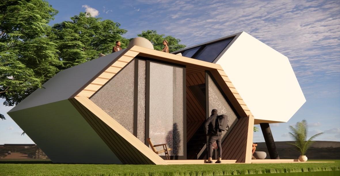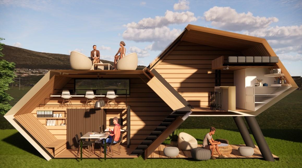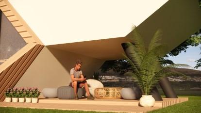 TheCocooncreatesaspacethatintegratesbothworkand lifestylewithinnature.Theentranceoftheofficefeaturesa largefrostedglassdoor,providingprivacy.Theirdailylives revolvearoundthismulti-purposespace.