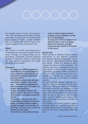 Membership IFMSA consists of national medical student associations of 102 different countries. Each National Member Organisation has its own identity, reflecting the national needs and culture. IFMSA is a federation which respects the autonomy of its members. The Objectives majority have Local Committees at the me• To expose all medical students to dical schools in their country. These Local humanitarian and global health is Committees coordinate IFMSA activities at sues, providing them with the op the local level. Through these Local Com portunity to educate themselves mittees, our members are in direct contact and their peers; with a hundreds of thousands of medical • To facilitate partnerships between students. the medical student community Our biannual international meetings are a and international organisations feast of cross-cultural interaction and edu also concerned work on health, ed cation. By meeting the most active students ucation and medicine; from other countries, our members not only • To give all medical students the learn about global health, but share their opportunity to take part in clinical ideas, skills and experience about how stu and research exchange around the dents can act on the issues that motivate world; them. A host of regional and national mee• To provide a network that links tings make these experiences available to active medical students across the many more. globe, including student leaders, Our emphasis on training supports capacity project managers and activists, so building within our member organisations, that they can learn from and be mo bringing benefits both for the student lea tivated by each other; ders and the other young people that they • To provide an international frame lead. Medical Students World Wide.