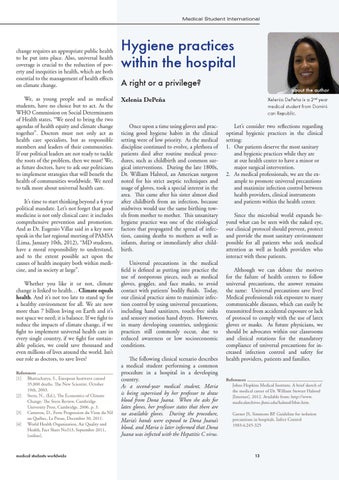change requires an appropriate public health to be put into place. Also, universal health coverage is crucial to the reduction of poverty and inequities in health, which are both essential to the management of health effects on climate change. We, as young people and as medical students, have no choice but to act. As the WHO Commission on Social Determinants of Health states, “We need to bring the two agendas of health equity and climate change together”. Doctors must not only act as health care specialists, but as responsible members and leaders of their communities. If our political leaders are not ready to tackle the roots of the problem, then we must! We, as future doctors, have to ask our politicians to implement strategies that will benefit the health of communities worldwide. We need to talk more about universal health care. It’s time to start thinking beyond a 4 year political mandate. Let’s not forget that good medicine is not only clinical care: it includes comprehensive prevention and promotion. And as Dr. Eugenio Villar said in a key note speak in the last regional meeting of PAMSA (Lima, January 10th, 2012), “MD students, have a moral responsibility to understand, and to the extent possible act upon the causes of health inequity both within medicine, and in society at large”. Whether you like it or not, climate change is linked to health… Climate equals health. And it’s not too late to stand up for a healthy environment for all. We are now more than 7 billion living on Earth and it’s not space we need; it is balance. If we fight to reduce the impacts of climate change, if we fight to implement universal health care in every single country, if we fight for sustainable policies, we could save thousand and even millions of lives around the world. Isn’t our role as doctors, to save lives? References [1] Bhattacharya, S., European heatwave caused 35,000 deaths. The New Scientist. October 10th, 2003. [2] Stern, N., (Ed.), The Economics of Climate Change: The Stern Review, Cambridge University Press, Cambridge, 2006, p. 3. [3] Cameron, D., Forte Progression du Virus du Nil au Québec, La Presse, December 30, 2011. [4] World Health Organization, Air Quality and Health, Fact Sheet No313, September 2011, [online].