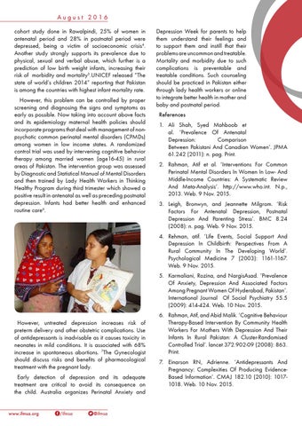 Depression Week for parents to help them understand their feelings and to support them and instill that their problems are uncommon and treatable. Mortality and morbidity due to such complications is preventable and treatable conditions. Such counseling should be practiced in Pakistan either through lady health workers or online to integrate better health in mother and baby and postnatal period. References 1. Ali Shah, Syed Mahboob et al. ‘Prevalence Of Antenatal Depression: Comparison Between Pakistani And Canadian Women’. JPMA 61.242 (2011): n. pag. Print. 2. Rahman, Atif et al. ‘Interventions For Common Perinatal Mental Disorders In Women In Low- And Middle-Income Countries: A Systematic Review And Meta-Analysis’. http://www.who.int. N.p., 2013. Web. 9 Nov. 2015. 3. Leigh, Bronwyn, and Jeannette Milgrom. ‘Risk Factors For Antenatal Depression, Postnatal Depression And Parenting Stress’. BMC 8.24 (2008): n. pag. Web. 9 Nov. 2015. 4. Rehman, atif. ‘Life Events, Social Support And Depression In Childbirth: Perspectives From A Rural Community In The Developing World’. Psychological Medicine 7 (2003): 1161-1167. Web. 9 Nov. 2015. 5. Karmaliani, Rozina, and NargisAsad. ‘Prevalence Of Anxiety, Depression And Associated Factors Among Pregnant Women Of Hyderabad, Pakistan’. International Journal Of Social Psychiatry 55.5 (2009): 414-424. Web. 10 Nov. 2015.