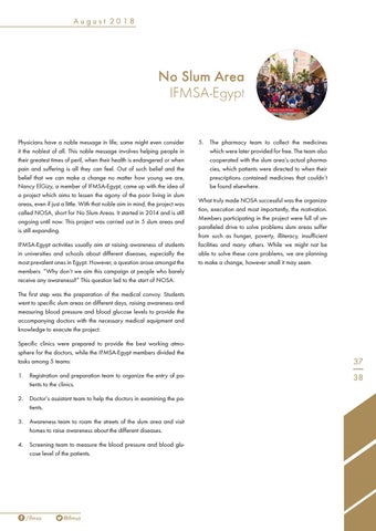 No Slum Area IFMSA-Egypt Physicians have a noble message in life; some might even consider it the noblest of all. This noble message involves helping people in their greatest times of peril, when their health is endangered or when pain and suffering is all they can feel. Out of such belief and the belief that we can make a change no matter how young we are, Nancy ElGizy, a member of IFMSA-Egypt, came up with the idea of a project which aims to lessen the agony of the poor living in slum areas, even if just a little. With that noble aim in mind, the project was called NOSA, short for No Slum Areas. It started in 2014 and is still ongoing until now. This project was carried out in 5 slum areas and is still expanding. IFMSA-Egypt activities usually aim at raising awareness of students in universities and schools about different diseases, especially the most prevalent ones in Egypt. However, a question arose amongst the members: “Why don’t we aim this campaign at people who barely receive any awareness?” This question led to the start of NOSA.