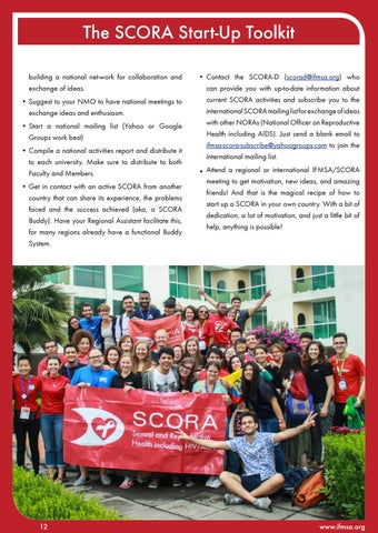 • Contact the SCORA-D (scorad@ifmsa.org) who can provide you with up-to-date information about current SCORA activities and subscribe you to the international SCORA mailing list for exchange of ideas with other NORAs (National Officer on Reproductive Health including AIDS). Just send a blank email to ifmsa-scora-subscribe@yahoogroups.com to join the international mailing list. • Attend a regional or international IFMSA/SCORA meeting to get motivation, new ideas, and amazing friends! And that is the magical recipe of how to start up a SCORA in your own country. With a bit of dedication, a lot of motivation, and just a little bit of help, anything is possible!