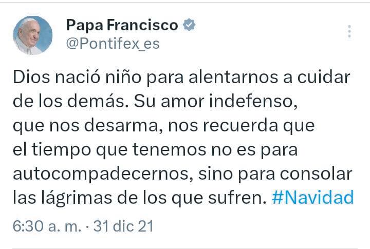 "Hoy, en efecto, nosotros seres humanos, con nuestros límites, abrazamos la certeza de una esperanza inaudita, la de haber nacido para el cielo. Sí, Jesús nuestro hermano vino a hacer que su Padre sea nuestro Padre. Siendo un Niño frágil, nos revela la ternura de Dios; y mucho más: Él, el Unigénito del Padre, nos da el «poder de llegar a ser hijos de Dios» (Jn 1,12). Esta es la alegría que consuela el corazón, que renueva la esperanza y da la paz; es la alegría del Espíritu Santo, la alegría de ser hijos amados".