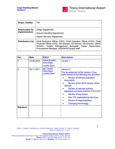Editor: I.Larashi Validated by: Andrea Gebbeken / Approved by: R. Castro-Vasquez Date of Validity 00.11.2011 Tirana International Airport SHPK Tirana International Airport Nënë Tereza, Administration Building, Rinas, Tirana, Albania Phone: 00355 4 2381000 Fax: 00355 4 2381 545 E-mail: info@tirana-airport.com Website: www.tirana-airport.com