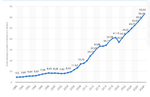 The gross domestic product in current prices in Bolivia was forecast to continuously increase between 2023 and 2028 by in total 16.2 billion U.S. dollars (+34.62 percent). After the eigth consecutive increasing year, the GDP is estimated to reach 63.03 billion U.S. dollars and therefore a new peak in 2028.