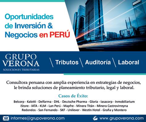 Aunque cualquier empresa que desee operar en Perú, ha de tener las conexiones precisas para moverse con fluidez en lo referente a las gestiones fiscales, y en ese campo Grupo Verona, se ha consolidado como la principal empresa en devoluciones tributarias del Perú, tanto para empresas nacionales como extranjeras. La apuesta del Gobierno peruano se basa en una serie de beneficios tributarios para los que se animen a invertir en el país, entre los que destaca la devolución anticipada del IVA en determinadas operaciones.