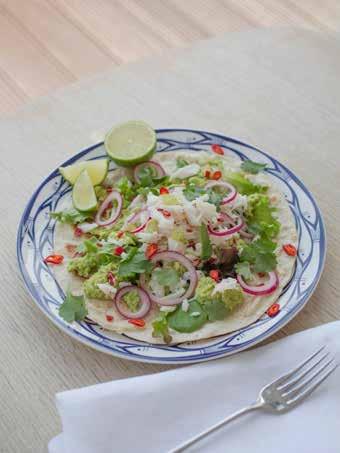 170g of white meat from a brown crab 1 small red onion, sliced into thin rings Juice of 2 limes, plus wedges to serve Pinch caster sugar 2 spring onions, finely sliced 1 medium red chilli, deseeded and chopped 1 really ripe avocado, peeled, stoned and chopped 1 small garlic clove, crushed 2 corn tortillas Cooking spray oil 2 handfuls mixed salad leaves